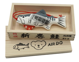 帯廣神社的には、機内販売でお求めになれる ミニチュア鮭箱「鮭とば」入り の箱に、当神社「鮭みくじ」をいれてディスプレーするのも楽しくおすすめです。(完全に蓋はしまりませんが、、、)
